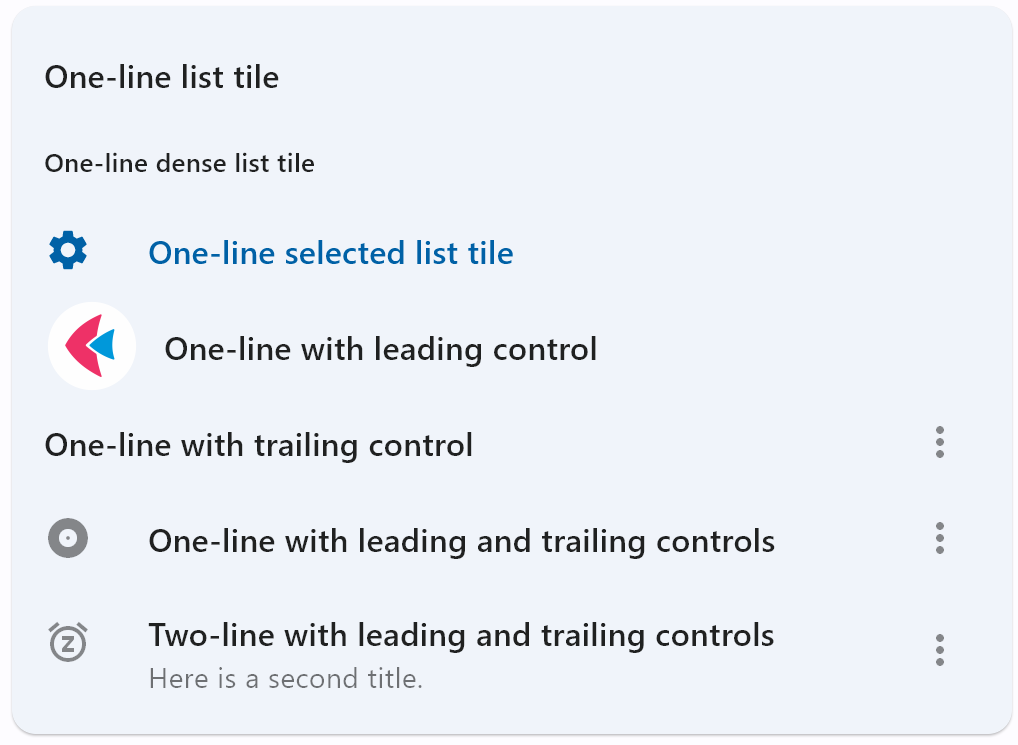 A single fixed-height row that typically contains some text as well as a leading or trailing icon.